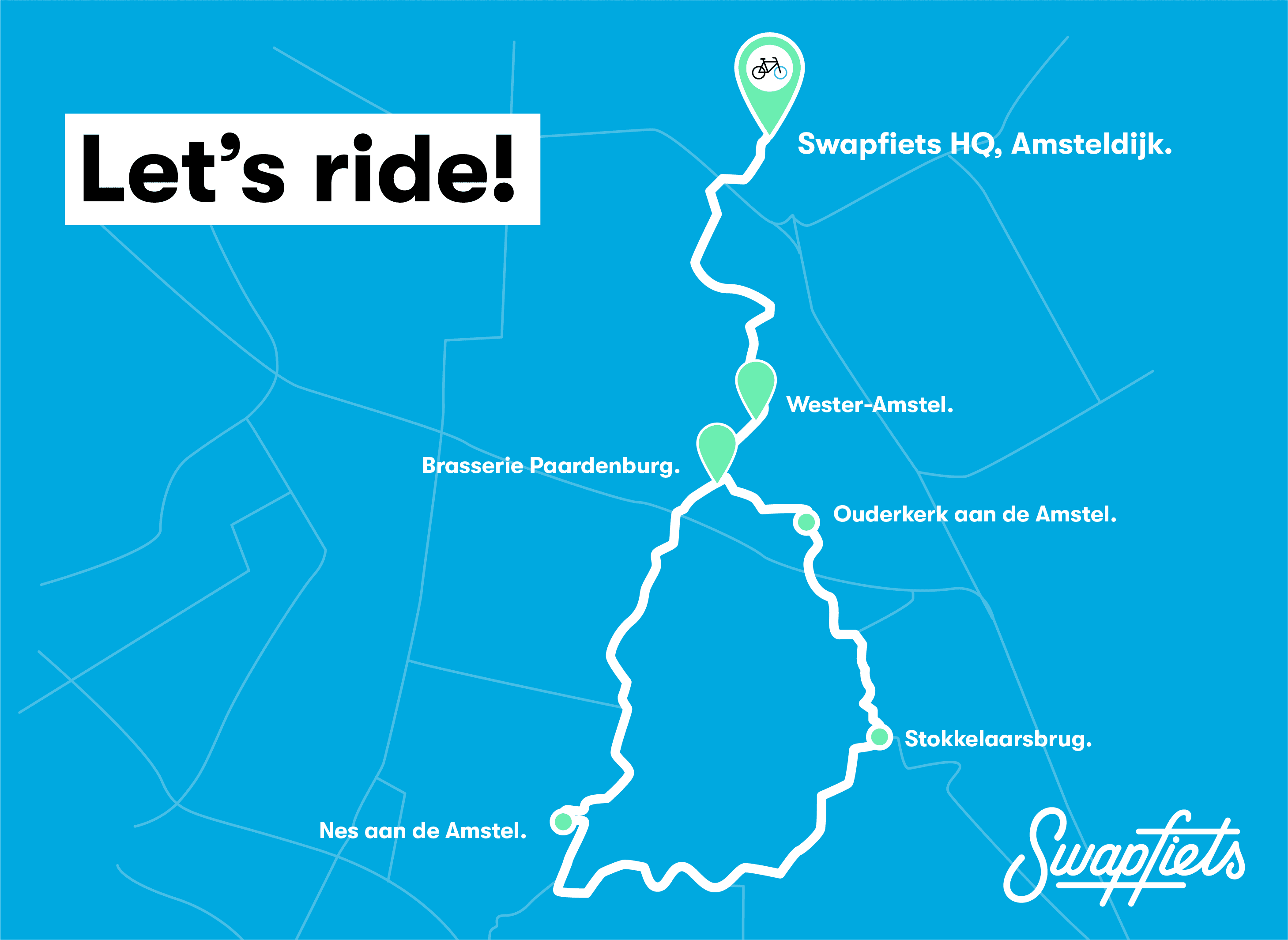 De tweede Swapfiets route vertrekt vanaf Amsterdam, de stad vernoemd naar de Amstel. En precies die rivier gaan we vandaag een stuk volgen, net zoals Rembrandt dat vroeger al vaak deed. Hij om inspiratie op te doen voor zijn schilderijen, wij gewoon om van het landschap te genieten. Dus hup, pak de fiets want het wordt genieten!